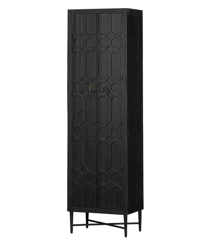 De Bequest hoge kast is onderdeel van de Bequest serie van het Nederlandse interieurmerk BePureHome. De Bequest serie is gemaakt van gerecycled grenenhout en heeft het kenmerkende design van uitgesneden houtwerk op de lade– en deurfronten. De geleefde look krijgen deze meubelen door de antieke, zwarte afwerking. Het metalen onderstel zorgt ervoor dat Bequest veel gewicht kan dragen en stabiel staat op rechte ondergronden.