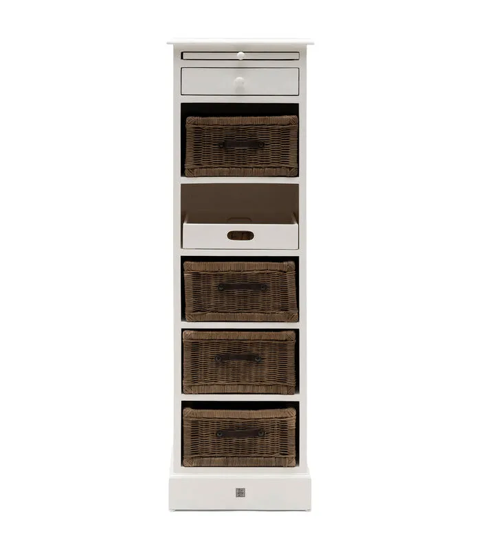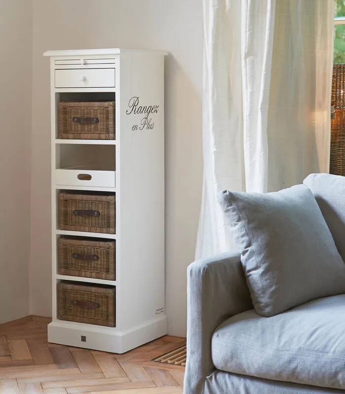 De Rangez en Plus collectie bestaat uit verschillende meubels om je spullen in te bewaren. Deze collectie kenmerkt zich door het gebruik en de combinatie van hard hout en rattan. Deze kast biedt ruimte aan twee houten lades, vier rattan lades en een mooi, houten dienblad.