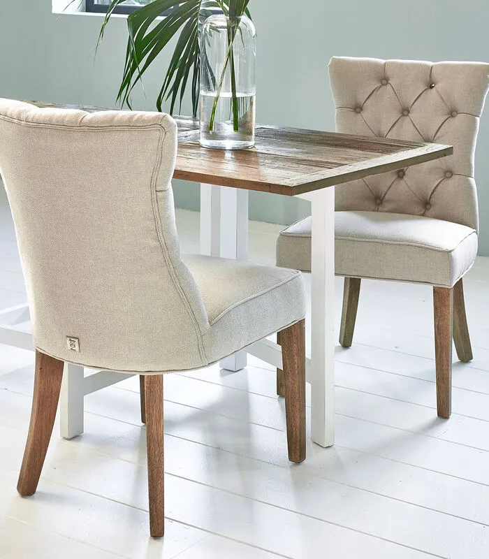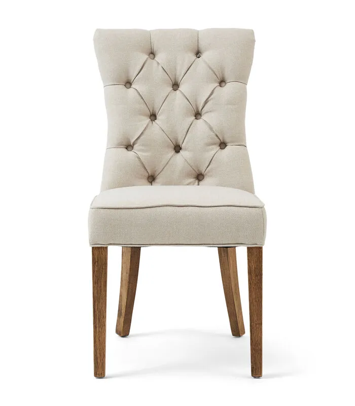 De Balmoral eetkamerstoel is een klassiek model: met een recht zitvlak, een rechte rugleuning en geen armleuningen. De zitting is zacht en comfortabel en de rugleuning is gecapitonneerd. Daardoor krijgt de stoel een luxe uiterlijk. De lichte stof flanders flax is sterk en duurzaam. De lichte eetkamerstoel in natureltint staat op vier rubberhouten poten.