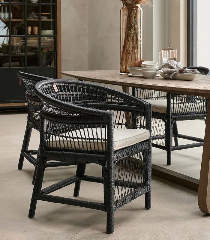 De Victoria Falls Dining Armchair is een luxe, zwarte eetkamerstoel gemaakt van rattan. De rattan stoel wordt helemaal met de hand gemaakt en gevlochten in Indonesië. De zwarte stoel heeft armleuningen die doorlopen in de rugleuning. De comfortabele eetkamerstoel wordt geleverd met lichtgekleurd, katoenen kussen.