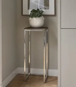 De Bushwick sidetable is een hoge, vierkante plantentafel die je kan gebruiken om een mooie lamp, plant of een ander decoratiestuk op te zetten. De combinatie van het iepenhouten tafelblad en het roestvrijstalen frame zorgt voor een unieke en warme uitstraling.