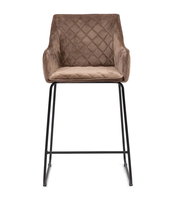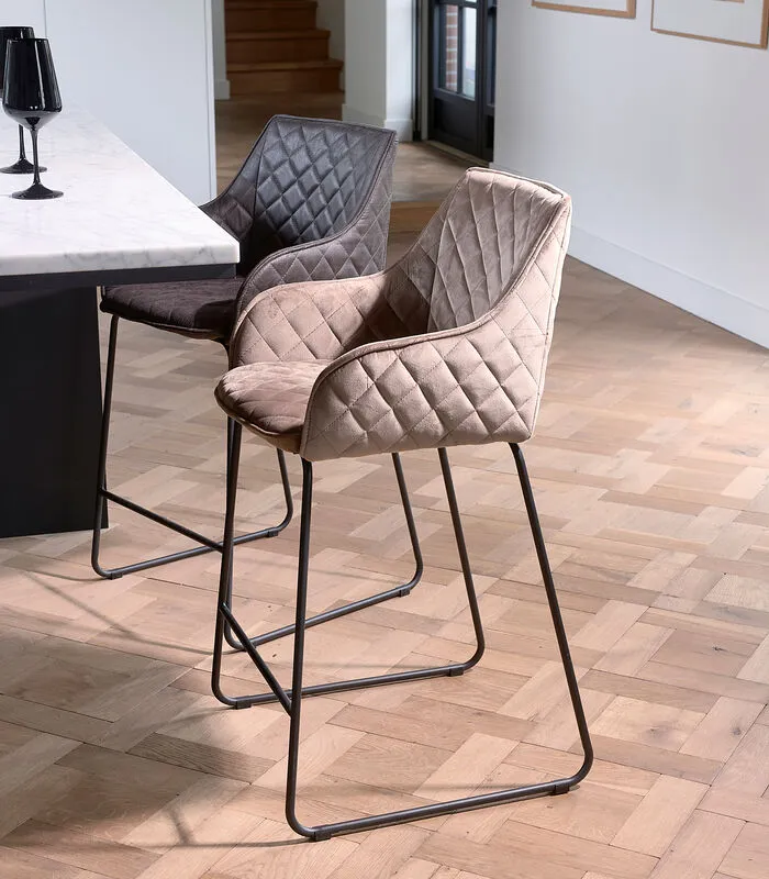 De Frisco Drive Counter Stool is een barkruk uitgevoerd in stevig velvet en verkrijgbaar in verschillende kleuren. De bekleding van de velvet barstoel heeft een doorgestikt ruitpatroon. De stoel heeft een verfijnd, donker ijzeren onderstel. Ook verkrijgbaar in andere materialen.