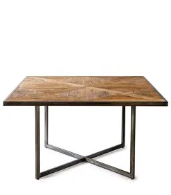 Dat staat ook heel mooi in huis: een vierkante eettafel. Die zijn er niet zo veel. Lekker ruim, plaats voor iedereen. Met heel veel liefde en vakmanschap gemaakt van gerecycled eiken– en essenhout. Mooie vierkante vlakken op het blad met schuin ingelegde brede strepen. Een metalen rand en onderstel maken deze milieuverantwoorde tafel compleet.