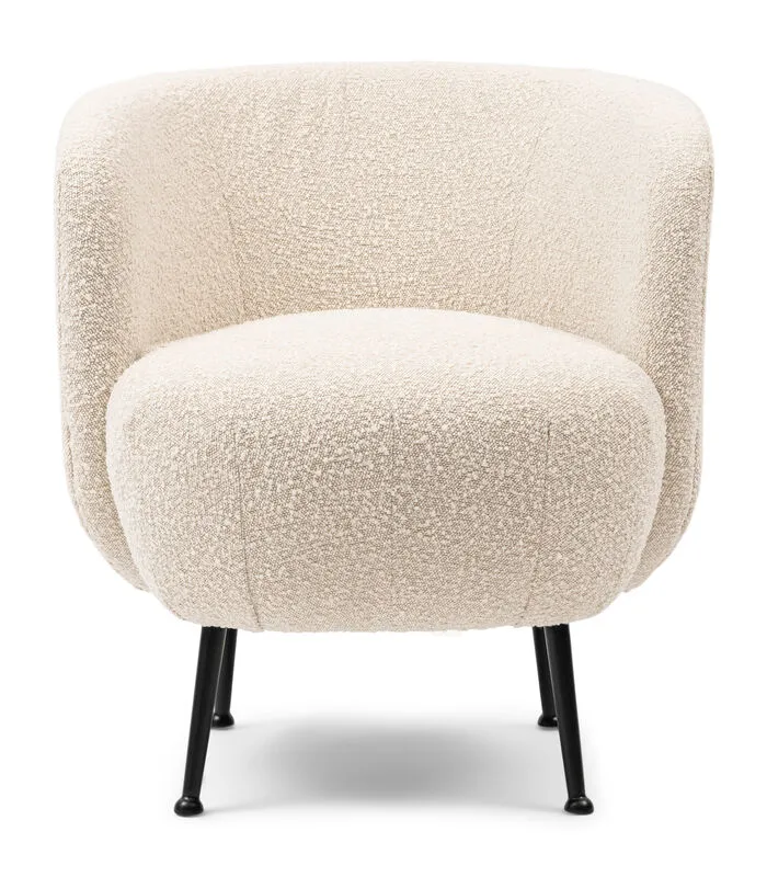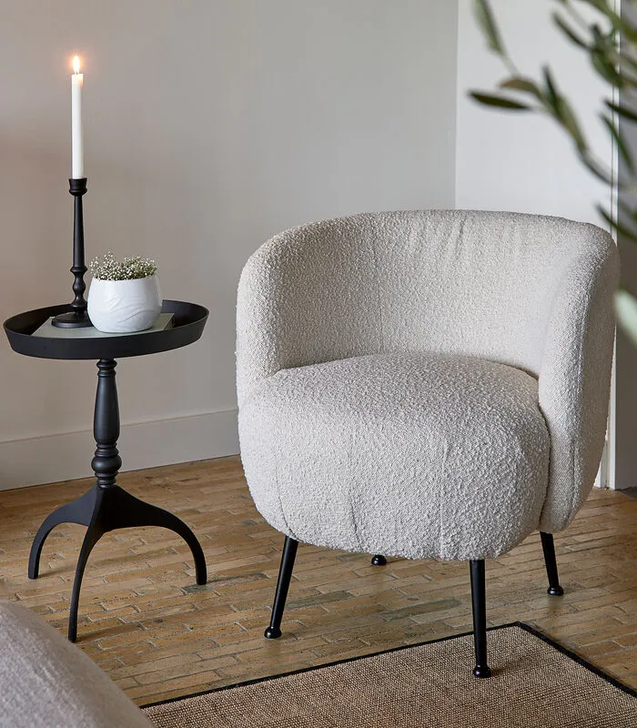 Dankzij de fijne bouclé bekleding in White Sand en de ronde vorm heeft deze eetkamerstoel een retrolook. De metalen, zwarte poten staan strak op de vloer. De stoel past erg goed in het interieur anno nu.