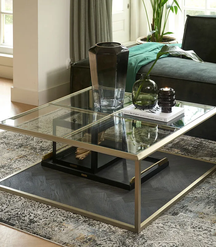 De Stanton salontafel is een chique, vierkante coffee table gemaakt van roestvrij staal in softgold. Het tafelblad is gemaakt van gehard glas. De bodem van de tafel is gemaakt van donker eikenhout dat is ingelegd in een visgraatpatroon. Een echte eyecatcher in je interieur! In de Stanton–serie is ook een end table verkrijgbaar.