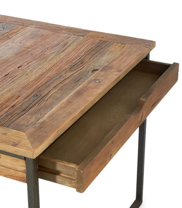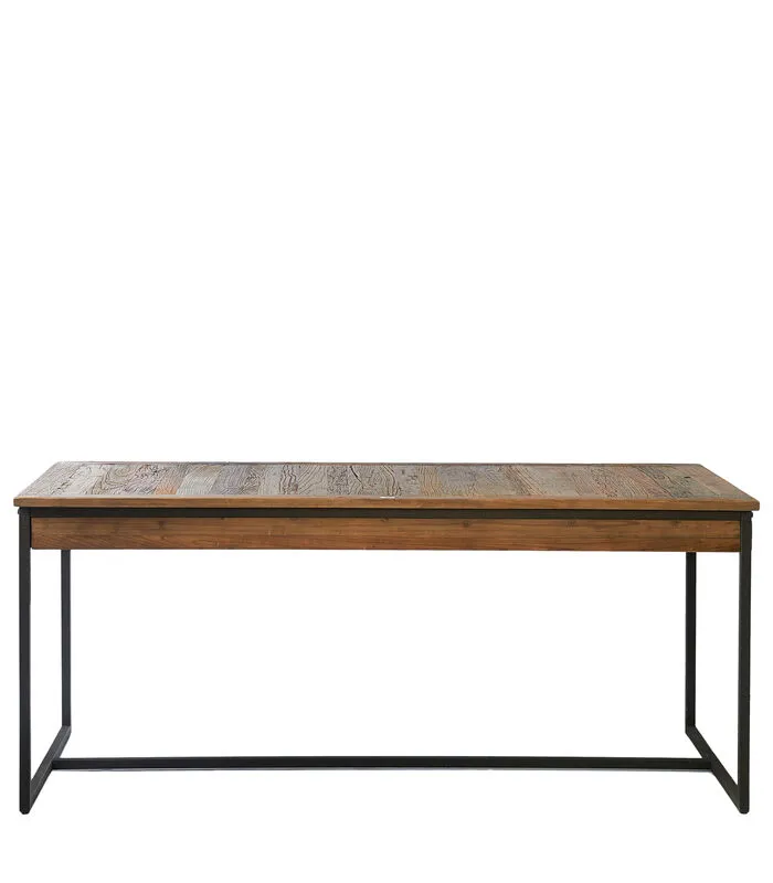 Een eigentijdse dinertafel met een robuust tafelblad van gerecycled iepenhout en sparrenhout. Het ijzeren frame geeft de tafel een industrieel karakter. De lades aan de zijkant bieden ruimte voor tafelaccessoires als placemats, onderzetters en eventueel tafellinnen. Een mooie aanvulling op de Shelter Island serie. Verkrijgbar in 200×90 en 180×90 cm.