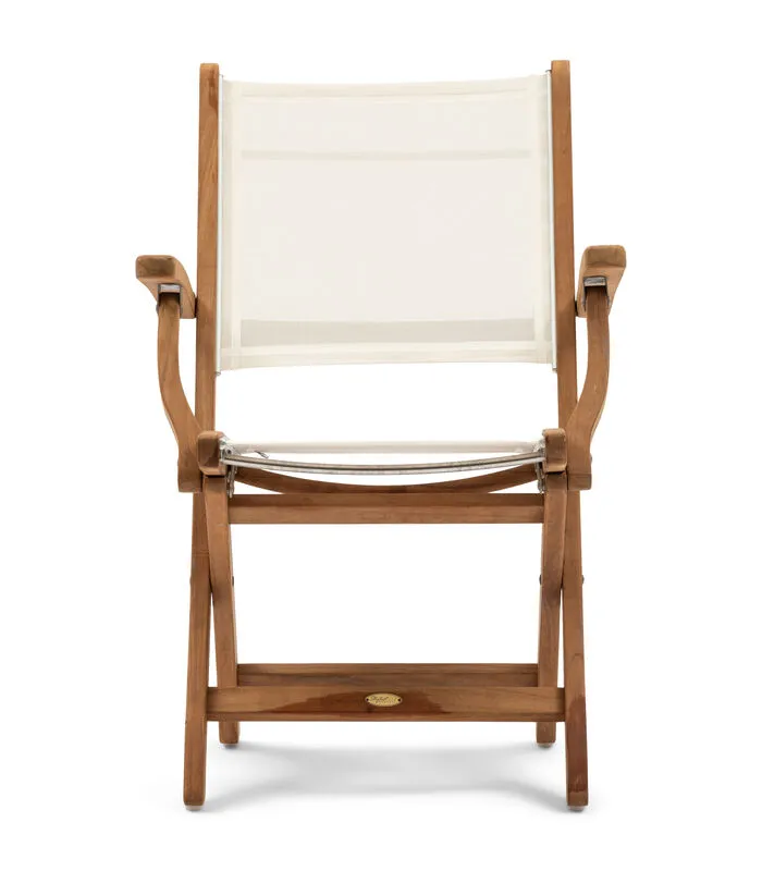 Dit is de outdoor eetkamerstoel met armleuningen uit de Gili–serie. Het frame is van stevig teakhout, de zitting en rug zijn gemaakt van het outdoor materiaal batyline, dat waterafstotend, maar niet waterdicht is. Dit heeft een mooie gebroken witte kleur en een geweven structuur. Verkrijgbaar in verschillende uitvoeringen.
