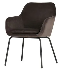De zitting van Mood is bekleed met een zacht fluwelen stof (100% polyester) in een mooi antraciet kleur. Het zitkussen en de armleuningen bieden extra zitcomfort. De Mood eetkamerstoel staat op een mat zwart gespoten metalen onderstel met vier iets uitlopende poten. De combinatie van materialen geeft de stoel een eigentijdse look.
