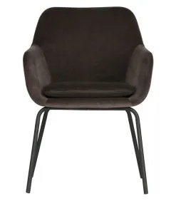 De zitting van Mood is bekleed met een zacht fluwelen stof (100% polyester) in een mooi antraciet kleur. Het zitkussen en de armleuningen bieden extra zitcomfort. De Mood eetkamerstoel staat op een mat zwart gespoten metalen onderstel met vier iets uitlopende poten. De combinatie van materialen geeft de stoel een eigentijdse look.