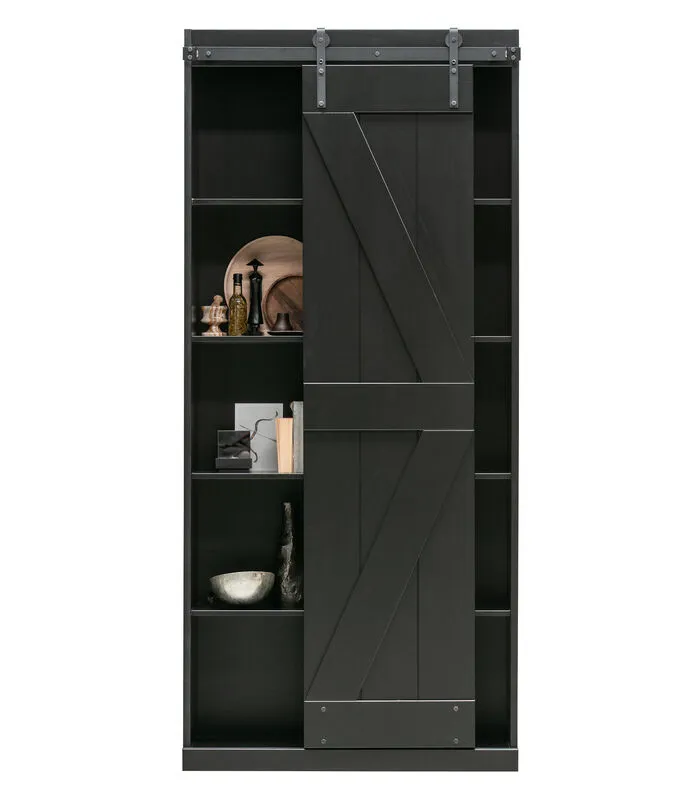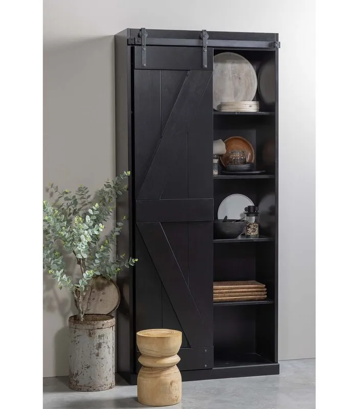 Deze stoere, eigentijdse schuifdeurkast Harris is een eigen ontwerp uit de collectie van het Nederlandse merk WOOOD. Harris is een kast met veel opbergmogelijkheden die gemaakt is van massief grenen (FSC) in een zwarte lak. De boerderijdeur hangt aan de bovenkant in een zwart metalen rail en schuif je gemakkelijk van links naar rechts.