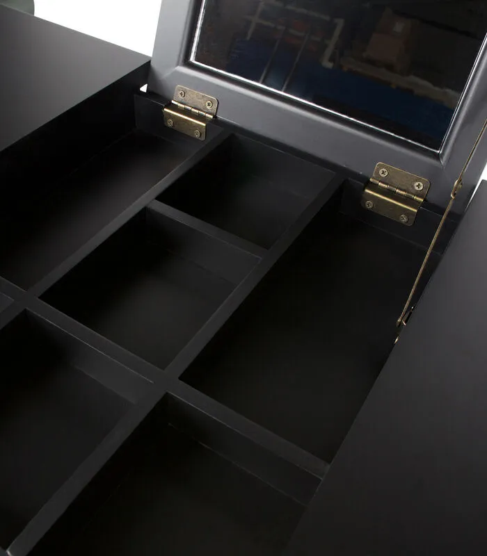 Romy, uit de collectie van WOOOD is een zeer elegante haltafel of sidetable die je in een handomdraai transformeert tot kaptafel. Haltafel Romy heeft een in haar blad verborgen spiegel, die je rechtop kunt klappen. Onder de spiegel zit een verborgen vakkenverdeling voor het opbergen van bijvoorbeeld al je make–up spulletjes. Ook heeft Romy twee lades voor nog meer opbergmogelijkheid. Plaats één van je mooiste accessoires op Romy, of een gave vaas met bloemen en je hebt een bijzonder stijlvol geheel. Romy is vervaardigd uit mat zwart gelakt grenenhout en MDF. Ze is 78 cm hoog, 75 cm breed en 38 cm diep. De breedte van de klapspiegel is 28 cm. De dikte van het blad bedraagt 2 cm. Deze haltafel staat op sierlijk hoge poten die een diameter hebben van 5 cm, de hoogte tot het kaptafelgedeelte is 60,5 cm. De ladefrontjes hebben zijn ieder (hxb) 9,5×25 cm. Artikelkenmerken